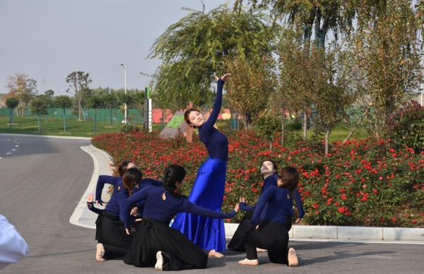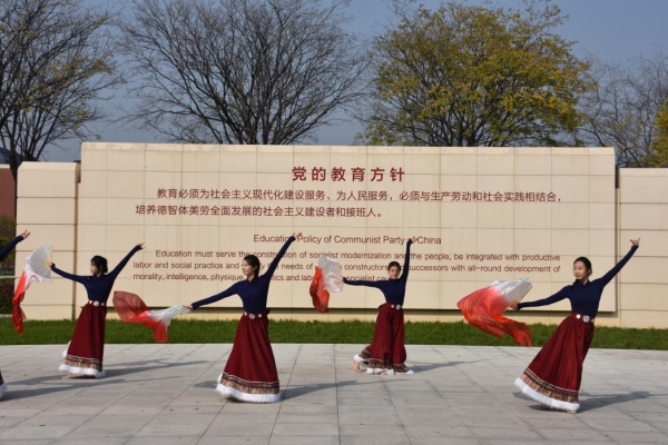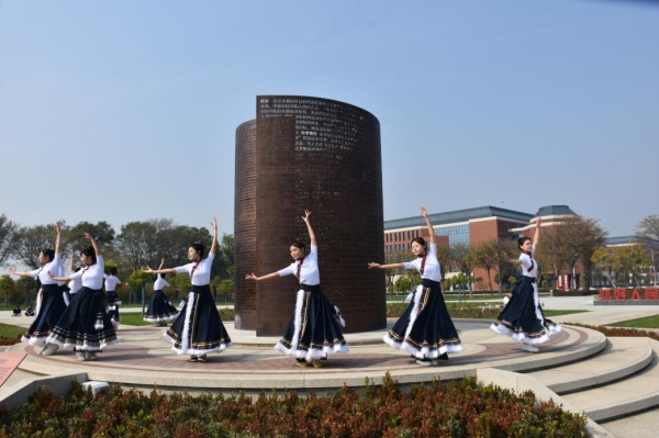 在青蓝冰水园、教育与艺术学部中心教学楼前,舞蹈专业学子量身编排的适配舞蹈,将红色基因的传承融入每一个跳跃、旋转与定格中。通过精准的队形变换和富有张力的肢体语言,让红色精神在舞步中得以延续与升华。