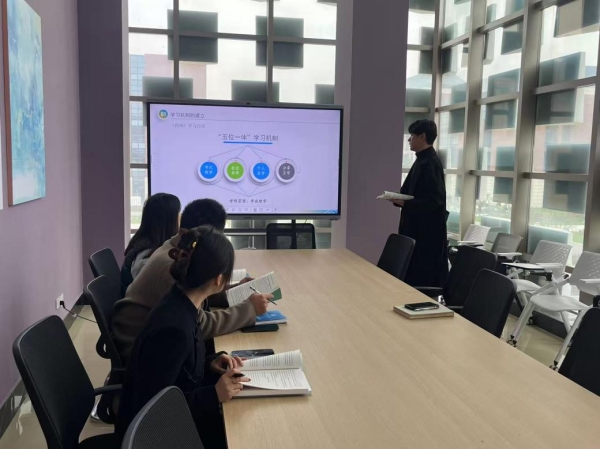 在会议的第一部分,曹啸天书记系统介绍了学院为保障学习效果而精心制定的“五位一体”学习办法。该方法体系具体包括:一是书记领学,由学院领导带头研读、解析重点;二是会议共学,通过每周组织集中学习、专题研讨,促进思想交流与碰撞;三是个体自学,要求全体成员利用业余时间深入研读,夯实理论基础;四是分享互学,搭建平台,让成员在交流心得、分享经验中共同进步;五是考试检学,通过阶段性考核检验学习成效,确保学深悟透、入脑入心。
